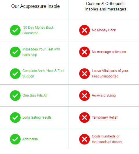 Our Acupressure insole uses 175 meticulously placed ‘acupoints' in each insole in order to relieve pressure in vital joints inside your body. There are also five natural magnetite magnets at key reflex acupoints that produce 400 gauss of healing magnetic waves. Targeting the root cause of your pain at the joints helps destroy the root cause of your pain, bringing long lasting relief.
